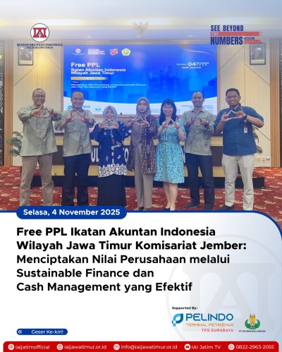 Jember, 4 November 2025 — Ikatan Akuntan Indonesia (IAI) Wilayah Jawa Timur menggelar rangkaian kegiatan Pelatihan Profesi Lanjutan (PPL) di Komisariat Jember pada Selasa, 4 November 2025. Acara yang berlangsung dari pukul 08.30 hingga 12.00 WIB...