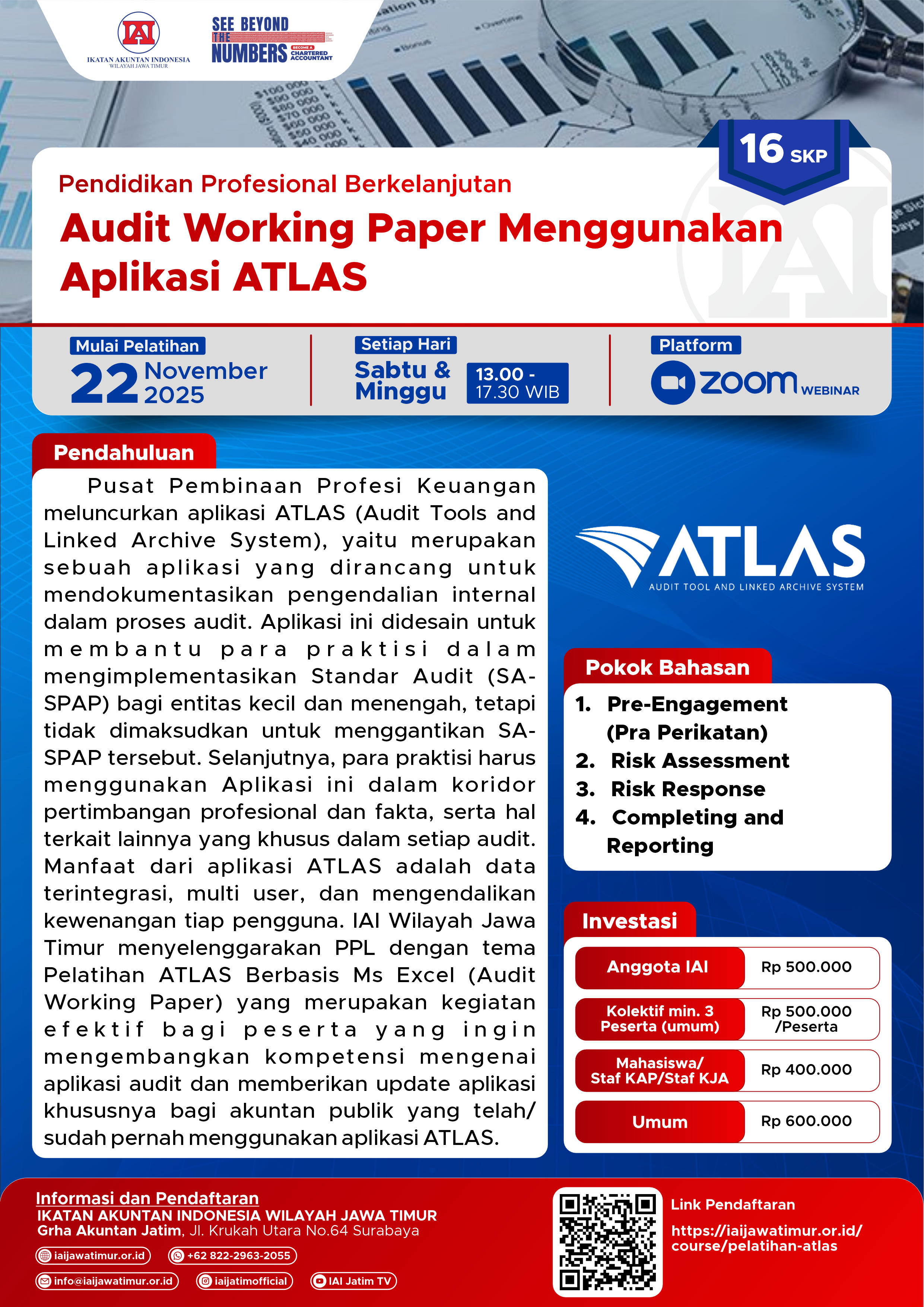 Pusat Pembinaan Profesi Keuangan meluncurkan aplikasi ATLAS (Audit Tools and Linked Archive System), yaitu merupakan sebuah aplikasi yang dirancang untuk mendokumentasikan pengendalian internal dalam proses audit. Aplikasi ini didesain untuk membantu para praktisi dalam mengimplementasikan Standar Audit (SA-SPAP) bagi entitas kecil dan menengah, tetapi tidak dimaksudkan untuk menggantikan SA-SPAP tersebut. Selanjutnya, para praktisi harus menggunakan Aplikasi ini dalam koridor pertimbangan profesional dan fakta, serta hal terkait lainnya yang khusus dalam setiap audit. Manfaat dari aplikasi ATLAS adalah data terintegrasi, multi user, dan mengendalikan kewenangan tiap pengguna. IAI Wilayah Jawa Timur menyelenggarakan PPL dengan tema Pelatihan ATLAS Berbasis Ms Excel (Audit Working Paper) yang merupakan kegiatan efektif bagi peserta yang ingin mengembangkan kompetensi mengenai aplikasi audit dan memberikan update aplikasi khususnya bagi akuntan publik yang telah/ sudah pernah menggunakan aplikasi ATLAS.