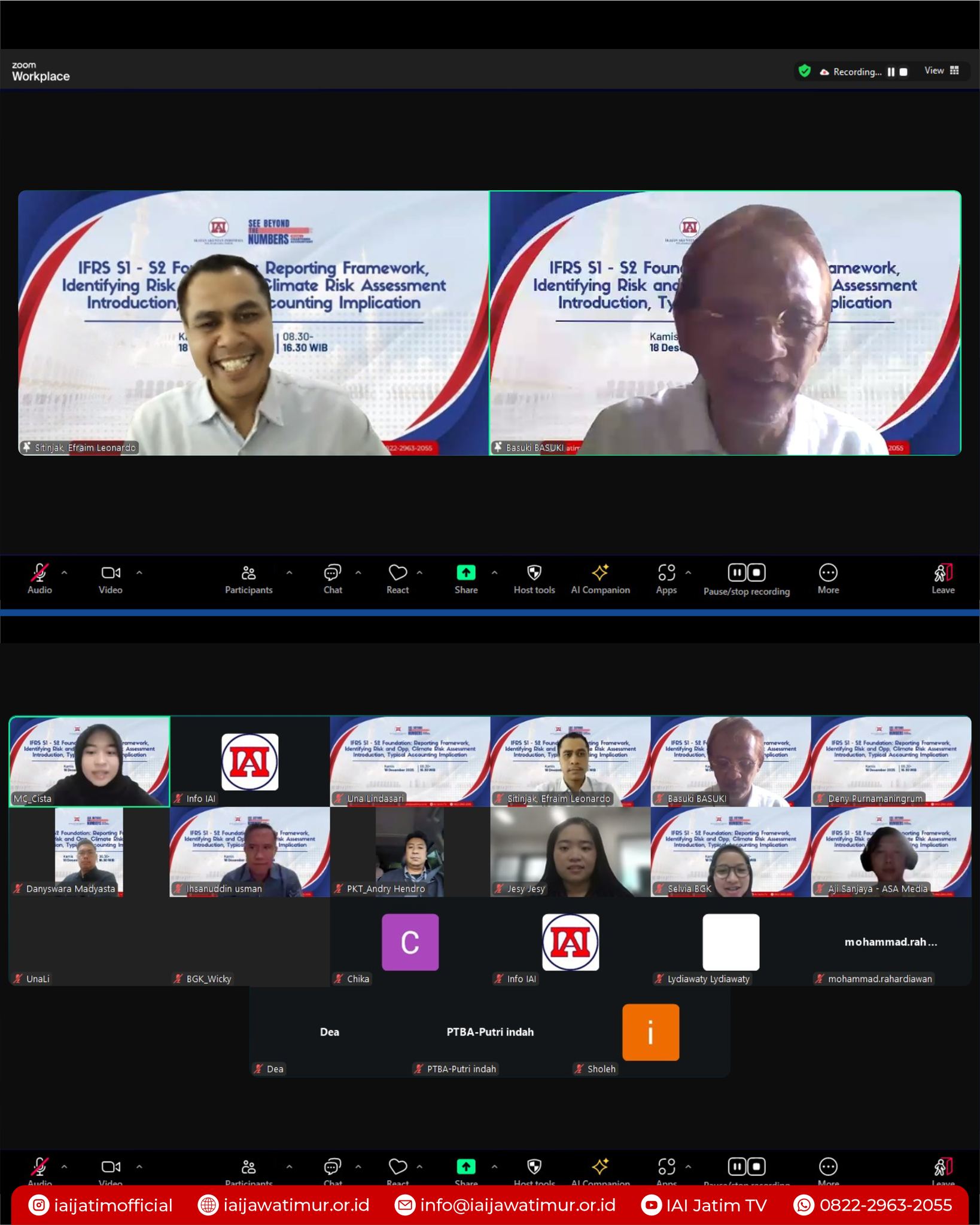 Ikatan Akuntan Indonesia (IAI) Wilayah Jawa Timur menyelenggarakan Pendidikan Profesional Berkelanjutan (PPL) bertema “IFRS S1–S2 Foundation” secara daring melalui Zoom Meeting pada Kamis, 18 Desember 2025. Kegiatan yang berlangsung pukul 08.30–16.30 WIB ini diikuti oleh para praktisi dari berbagai institusi, baik sektor publik maupun swasta, yang memiliki perhatian terhadap isu pelaporan keberlanjutan.