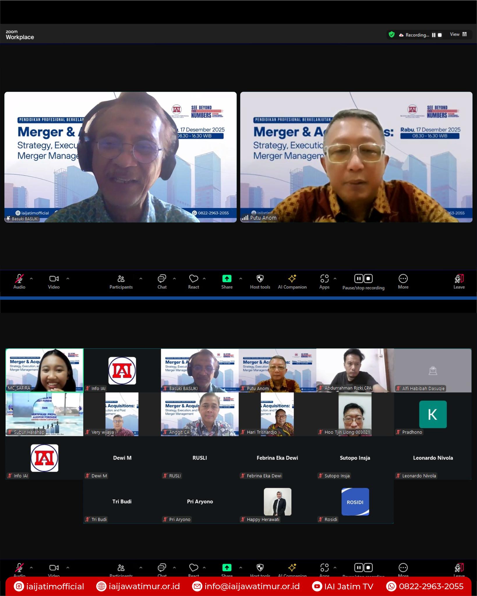 Surabaya – Ikatan Akuntan Indonesia Wilayah Jawa Timur kembali menyelenggarakan kegiatan Pendidikan Profesional Berkelanjutan (PPL) bertajuk “Merger & Acquisitions: Strategy, Execution, and Post Merger Management” pada Rabu, 17 Desember 2025. Kegiatan ini dilaksanakan secara daring melalui Zoom Meeting dan diikuti oleh para akuntan, praktisi keuangan, serta akademisi dari berbagai daerah.