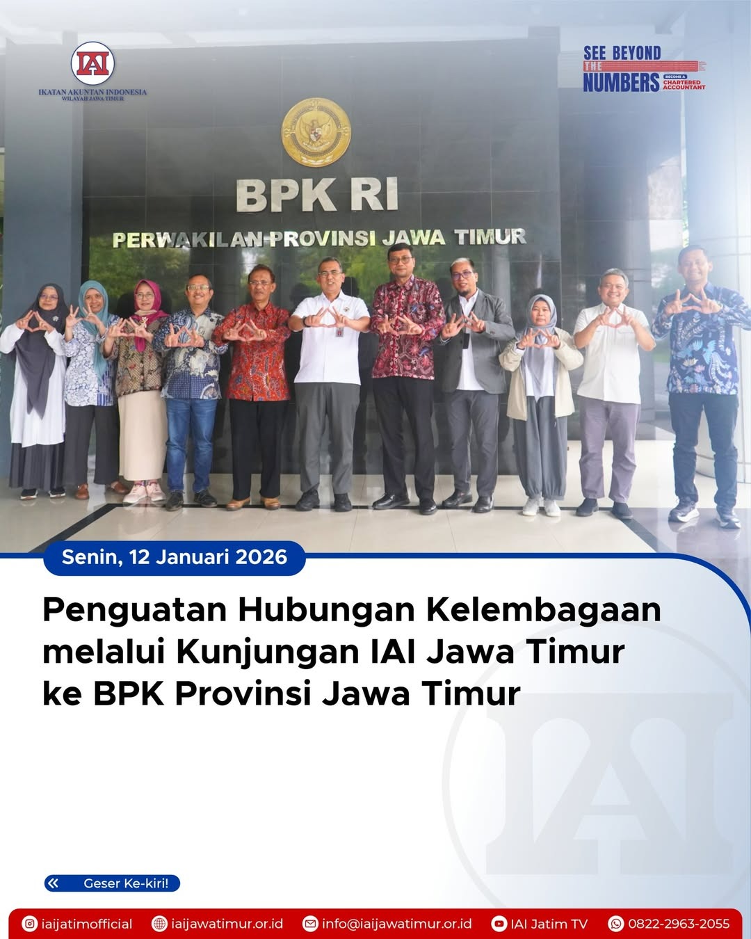 Ikatan Akuntan Indonesia (IAI) Wilayah Jawa Timur melakukan kunjungan silaturahmi ke Kantor Perwakilan Badan Pemeriksa Keuangan (BPK) Provinsi Jawa Timur pada Senin, 12 Januari, sebagai upaya mempererat hubungan kelembagaan dan memperkuat sinergi antarlembaga.